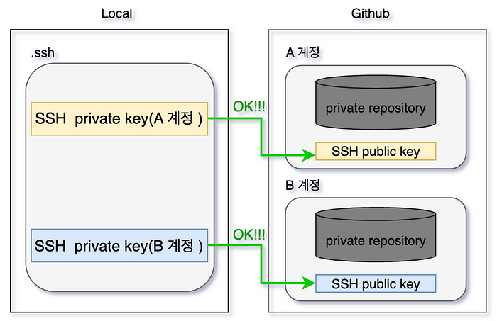 1. 로컬에 A 계정, B 계정의 SSH key pair를 각각 구성한다. (각 키는 구분될 수 있게 네이밍 한다)
