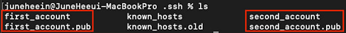그래서 2번 스텝까지 완료한 상태에서는 A, B private repository 모두 ssh로 접근할 수 없다. 우리는 비밀키를 first_account, second_account로 만들었고 .ssh 디렉터리에는 id_rsa라는 비밀키는 존재하지 않기 때문이다.