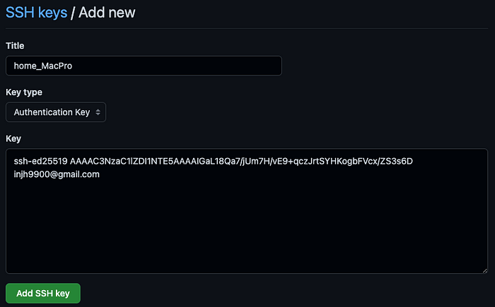 각 계정으로 로그인하여 Settings -> SSH and GPG keys -> SSH keys에 공개키(*.pub)를 등록한다.