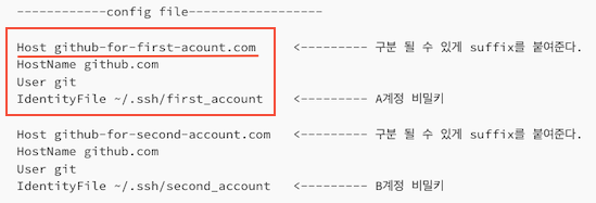 Host github-for-first-acount.com <----- 구분될 수 있게 suffix를 붙여준다.