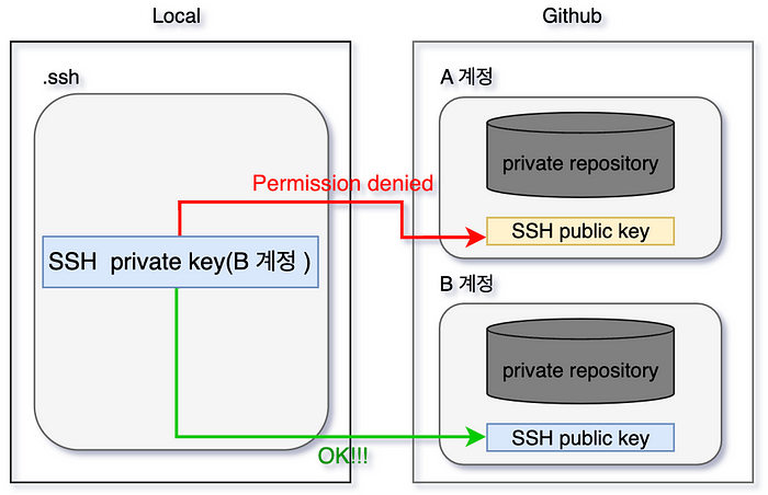 나는 Github에 A 계정과 B 계정을 가지고 있다. 현재 로컬에 있는 SSH key pair는 B 계정의 SSH key pair이다.